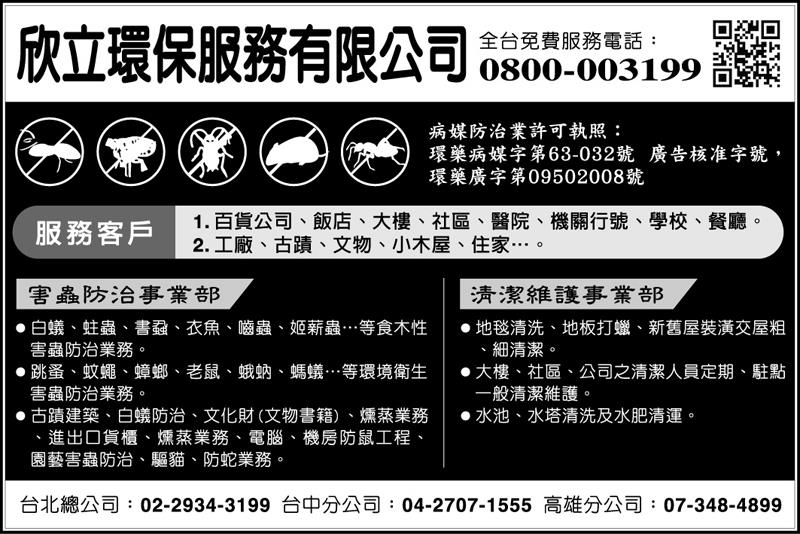 欣立除蟲服務全台灣,洽詢服務專線:(02)2261-7888 (04)2707-1555 (07)348-4899 0800-003-199 http://www.cleanliness.tw