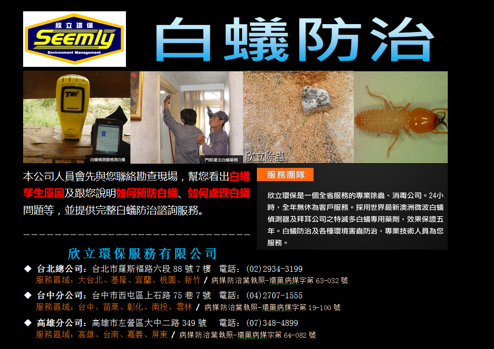 消除白蟻、抓白蟻、除白蟻diy、除白蟻藥、白蟻油、除白蟻推薦、如何除白蟻、驅除白蟻、抓白蟻、防止白蟻、大白蟻、白蟻怎麼處理、特滅多白蟻藥、消除白蟻、除白蟻推薦、如何殺死白蟻、白蟻防治方法、消毒公司推薦、除蟲專家、最專業的白蟻公司、宜蘭地區除白蟻公司、白螞蟻防治方法、病蟲防治、大白蟻、防止白蟻、特滅多白蟻專用藥劑、除白蟻公司台南、白蟻怎麼處理、除蟲公司新竹、拜耳白蟻藥-欣立創新除蟲業品牌、強調除蟲效果、堅持用藥安全、提昇生活品質、維護居住環境-欣立除蟲公司-服務全台灣-24小時全年無休----欣立除蟲公司---欣立消毒公司---欣立除白蟻公司---全台洽詢服務專線:0800-003-199 (02)2261-7888 (04)2707-1555 (07)348-4899 http://www.seemly.com.tw/photo.php?act=pword&id=1